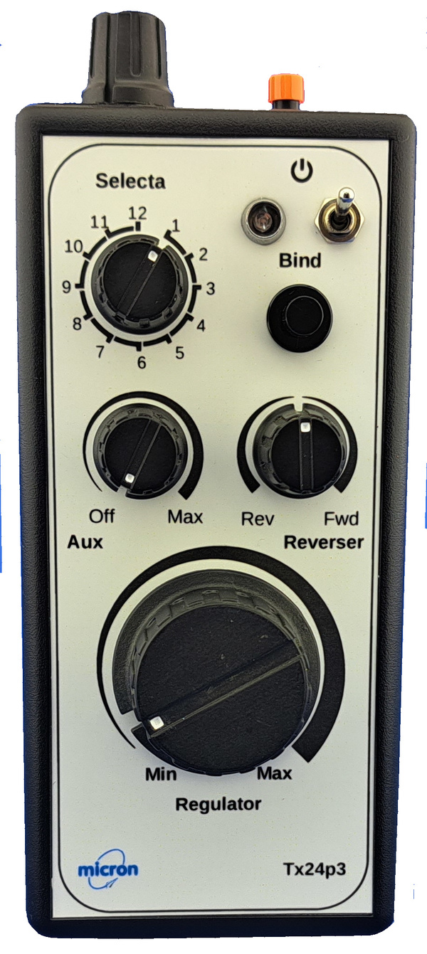 Tx24p3 is a hand-held wireless transmitter intended to control live-steam locomotives or battery electric locomotives with the speed controller set to low-off throttle operation. It has rotary controls for low-off regulator, centre-off reverser, inertia and auxiliary (e.g blower or gas) plus a 12-way loco selection switch and 2 push buttons for functions such as steam whistle, lighting or couplers.